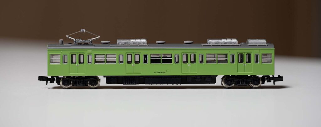 旧型国電72系の車体を新性能車と同じものにした72系970番台。それを種車として台車・電装品・パンタを換装したら103系3000番台となりました。冷房装置として分散式のAU712を一両当たり2台搭載。電源装置も並んだ屋根上はなんともユニークです。