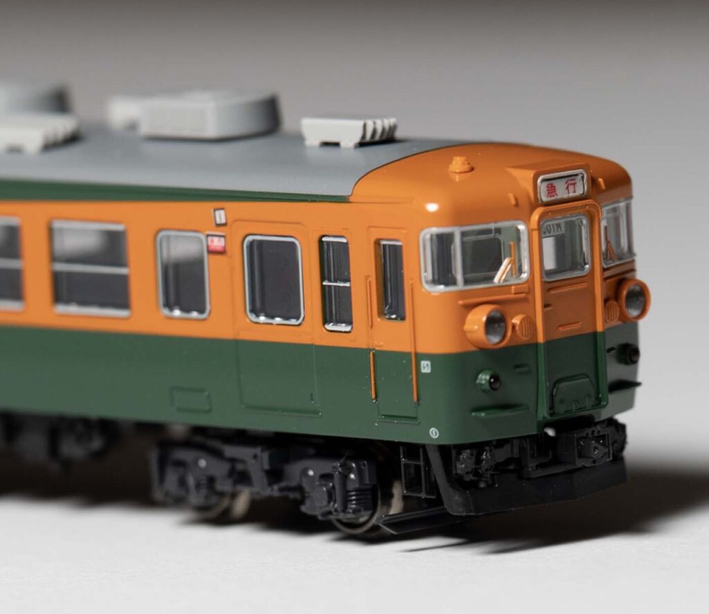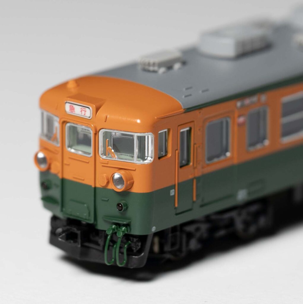 ちょい古めの1975年頃をモデル化しています。原型ヘッドライトが熱いですね。Hゴムグレーなど拘りの仕様。狭小トンネル対応低屋根のモハ164-800番台が組み込まれています。